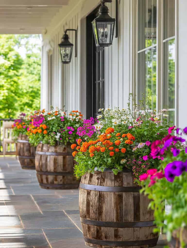 A rustic barrel planter gives your porch a cozy, farmhouse vibe and provides plenty of room for a bountiful display of flowers.