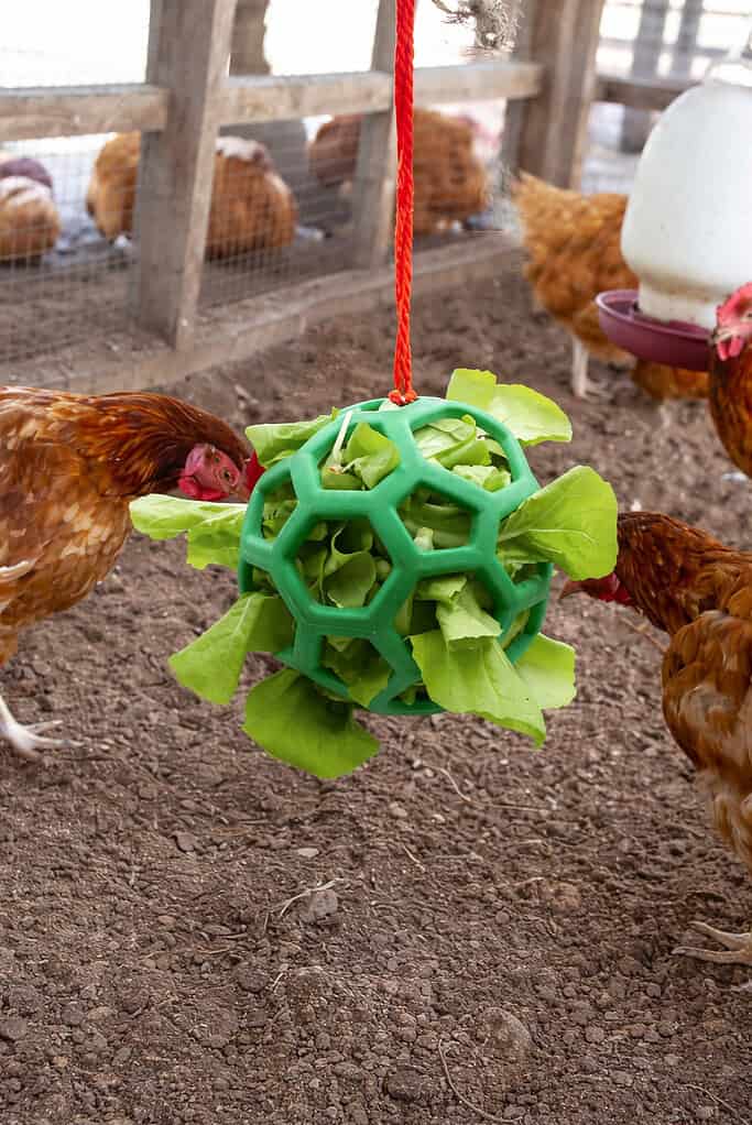 - DIY Treat Ball: Take a cabbage, head of lettuce, or bundle of leafy greens and hang it by a string in the coop/run (like a tetherball). Alternatively, use a mesh produce bag or a suet cage, fill it with vegetable scraps or treats, and hang it at chicken head-height. Some people use a Hol-ee roller dog toy stuffed with produce as a durable treat ball.