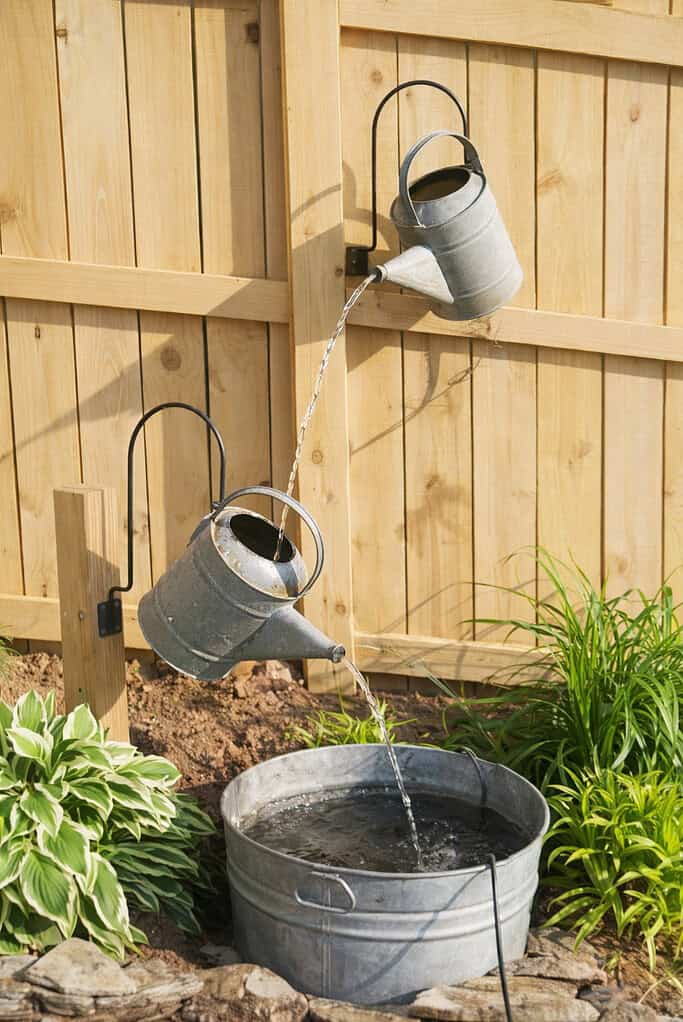 This idea brings farmhouse flair and whimsy to any garden. Imagine a classic metal watering can appearing to pour an endless stream of water into a basin below – it’s like a live-action garden sculpture!