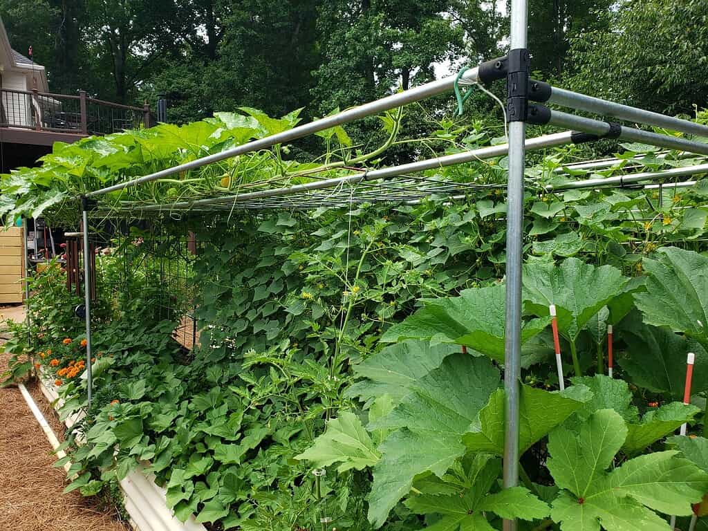 Trellises, cattle panels, and wall-mounted planters allow you to grow vining crops like cucumbers, beans, squash, and tomatoes without sacrificing ground-level planting space.