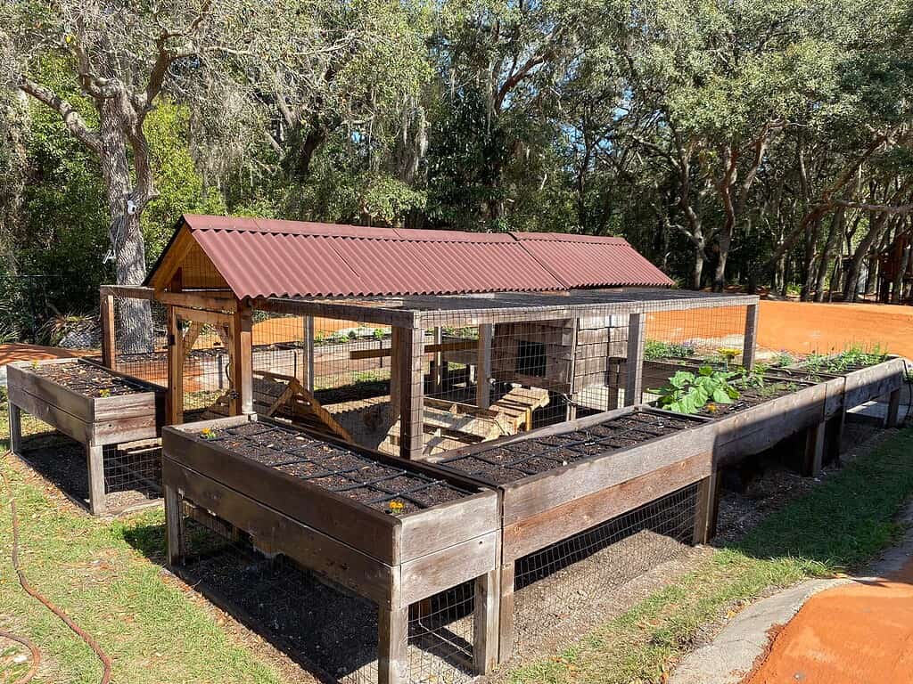 For example, a small coop can sit on two side-by-side raised beds (with soil). The beds provide fresh greens the hens can peck, and their waste fertilizes the plants.