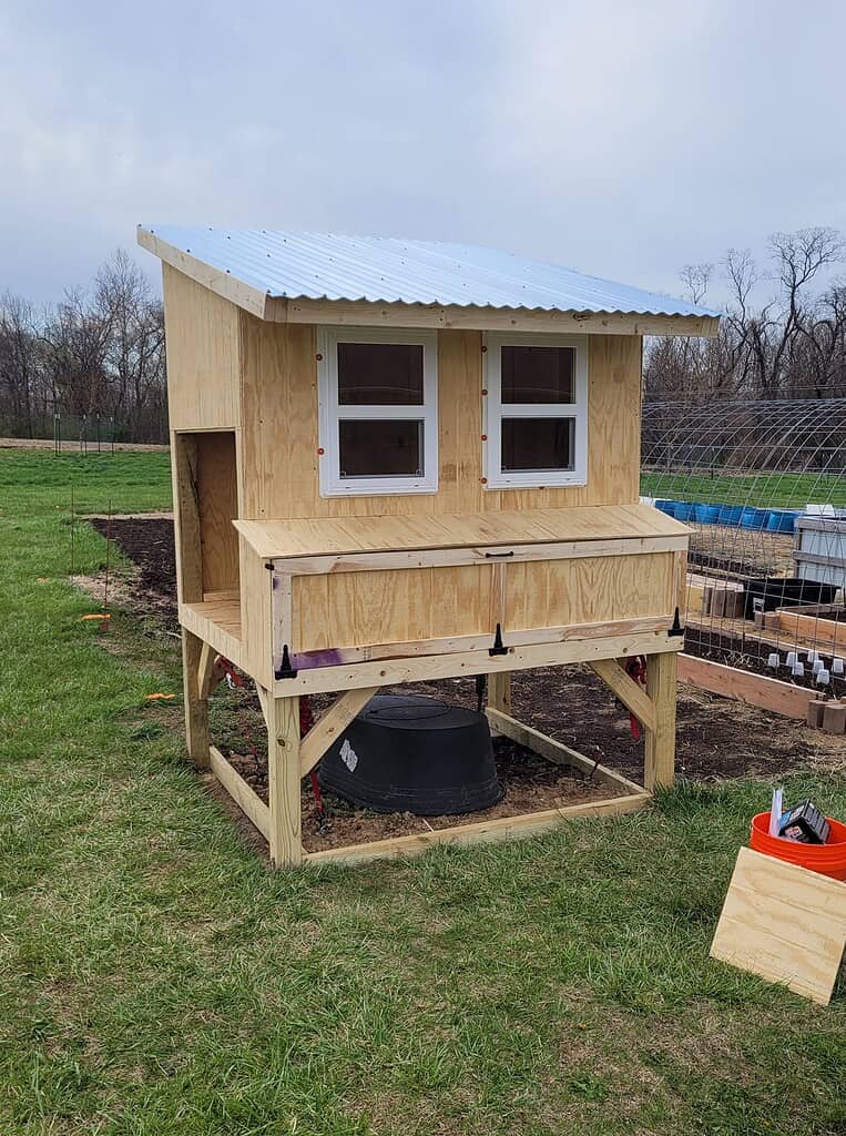 The coop sits high enough off the ground to keep the interior dry and well ventilated, while the open space underneath can be enclosed or partially enclosed for shade and movement during the day. The slanted metal roof helps with rain runoff and keeps the interior cooler during warm weather.