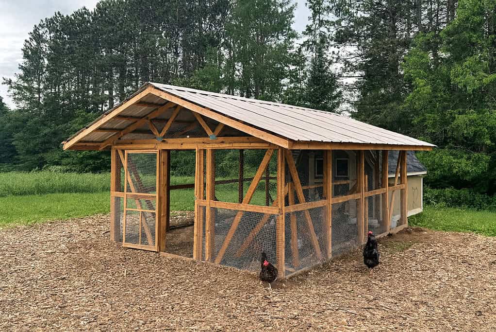 For example, if you’re planning on 6 chickens, a run size of 6 ft x 15 ft (90 sq ft) should be the bare minimum in snowy areas. If you have space, bump that up to 8 ft x 16 ft (128 sq ft) or larger.